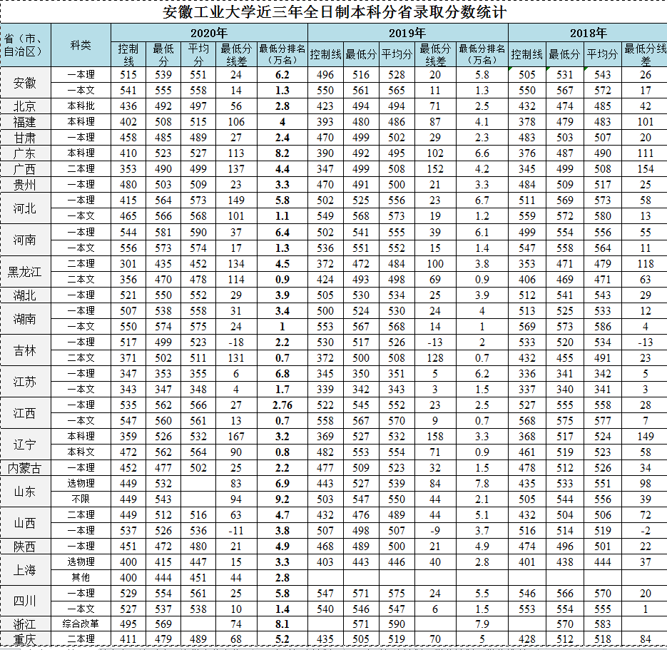 安徽工业大学2018-2020年全日制本科分省录取分数