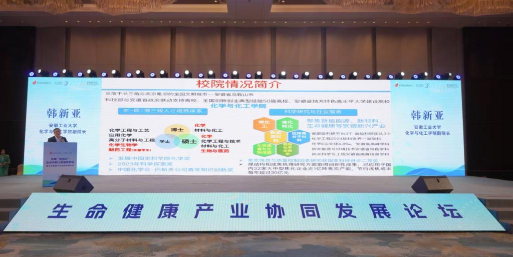 11月24日,由安徽省科技厅、省卫生健康委、马鞍山市人民政府共同主办,马鞍山市科技局、马鞍山市卫生健康委、马鞍山市投资促进中心、慈湖高新区管委会和安徽皓元药业有限公司联合承办的“安徽‘双创汇’走进马鞍山慈湖高新区暨生命健康产业协同发展论坛”在我市举行。省科技厅、卫健委领导、马鞍山市政府领导、各市直机构领导、马鞍山慈湖高新区领导及相关部门负责人、高校院所、国内外生物医药产业企业负责人、产业资本、服务机构等共约180人参会。本次活动旨在通过开展学术交流、分享创新成果,积极推动我市生命健康产业的高质量发展。安徽工业大学郑啸副校长以及36365线路检测中心党委书记黄宇弦、副院长韩新亚等出席本次活动。