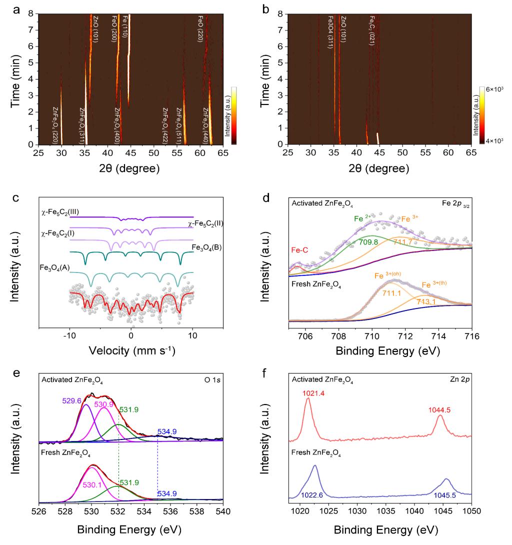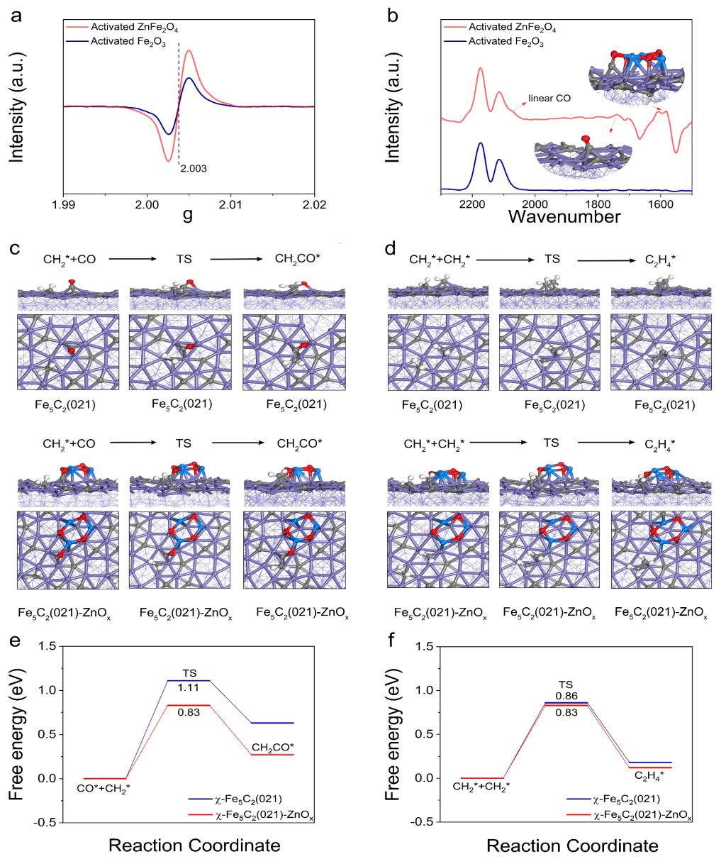 机理研究表明,碳化物与一氧化碳插入路径的协同作用促进了碳链增长。铁基催化剂中,锌元素的引入一方面会增加表面氧空位数量,促进二氧化碳的活化。另一方面,铁-锌形成的界面作为一氧化碳非解离吸附位点,提供了一氧化碳插入的碳链增长新路径,从而有效抑制了一氧化碳和甲烷等C1副产物的生成。