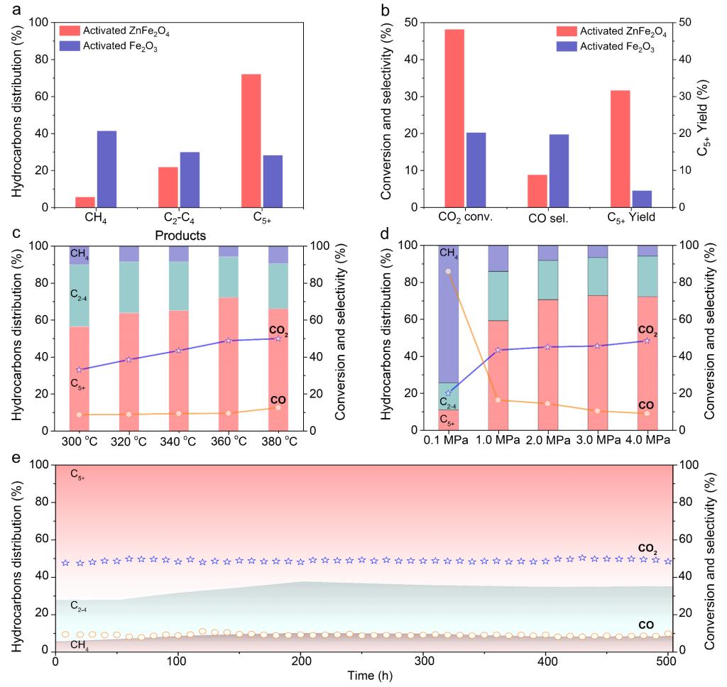 二氧化碳分子具有较高的热力学稳定性和显著的化学惰性,其活化过程本身极具挑战。由于二氧化碳加氢生成液体燃料是一个放热反应,直接提高反应温度不仅会降低二氧化碳的平衡转化率,还会降低目标产物的选择性。在二氧化碳加氢过程中,尤其在高温时,逆水煤气变换反应难以避免,会导致一氧化碳选择性升高;同时,副产物甲烷的选择性也常常超过15%。为抑制C1副产物的选择性,人们开发了多种方法,如疏水封装、引入碱金属添加剂、掺杂电子调节剂等,但这些催化剂往往受限于较低的二氧化碳转化率,致使液体燃料收率有限。截止到该工作报道之前,二氧化碳加氢制液体燃料的单程收率未超过30%。为了突破收率瓶颈,曾杰教授团队开发了一种熔盐辅助策略,构建了富含界面位点的铁锌催化剂,并实现了高达31.7%的二氧化碳加氢制液体燃料单程收率世界记录。经过500小时的连续运行,该催化剂的性能依然保持稳定。