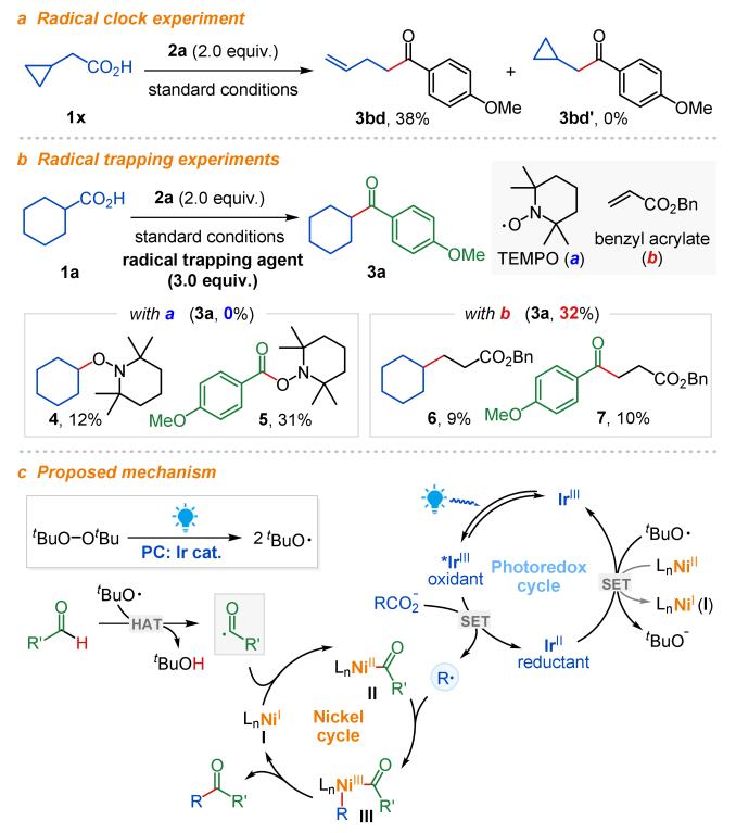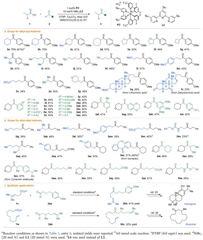 为解决上述难题,该研究团队创造性地使用叔丁基过氧化物作为氧化剂和氢原子转移试剂,将烷基羧酸盐的单原子氧化脱羧和醛的氢原子转移有机地结合起来,通过镍催化的自由基-自由基交叉偶联,首次实现烷基羧酸与醛的直接脱羧交叉酰基偶联反应。