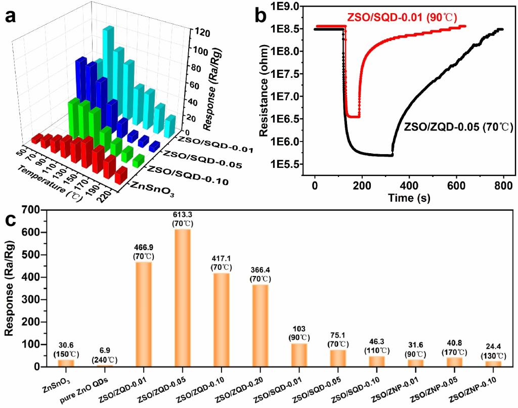 (修饰不同比例ZnO量子点的ZnSnO3复合材料在不同温度下对不同气体的响应)