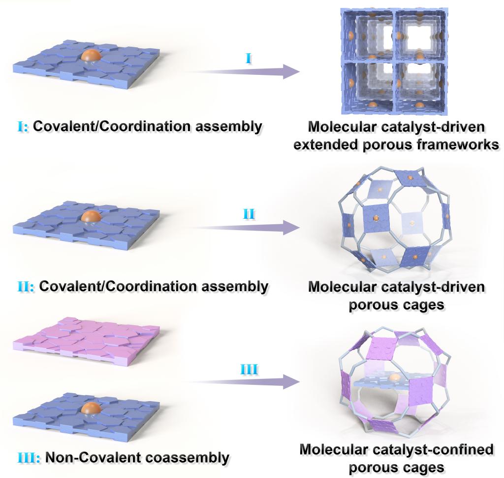 由金属中心和有机配体组成的分子催化剂,在过去的几十年中一直是化学和材料科学中最前沿的发展方向之一。由于分子催化剂中金属活性位点和分子配体的高度可设计性,因此它们的催化活性具有可调控性。然而,一些疏水性分子催化剂(例如酞菁和卟啉基有机催化剂),其在溶液中倾向于聚集,往往导致催化剂失活。从原理上讲,以下几种策略可以解决这个关键问题:首先,利用分子催化剂构建高度结晶的多孔材料,可以锚定活性位点(策略I),例如金属-有机框架(MOFs)和共价有机框架(COFs),极大地防止了活性位点的聚集,与其分子催化剂前驱体对比,自组装多孔框架的催化剂因其超高表面积、限域的孔道和可调结构而往往显示出较高的催化效率。然而,由于其它们固有的特性可能会妨碍底物和中间体在纳米孔道中的传质。其次,由分子催化剂构建的离散型超分子多孔有机或配位分子笼策略(策略II),这种策略可以有效克服策略I中存在的传质问题,这些金属笼超分子催化剂表现出优异的类酶活性,可用于化学转化,然而,用于构建这些纳米笼的配体多为芳香疏水结构,会不可避免地触发分子笼间的聚集,因此这些分子催化剂中对环境敏感的催化位点,在超分子催化过程中仍然不能完全被隔离,进而导致催化活性的损失。