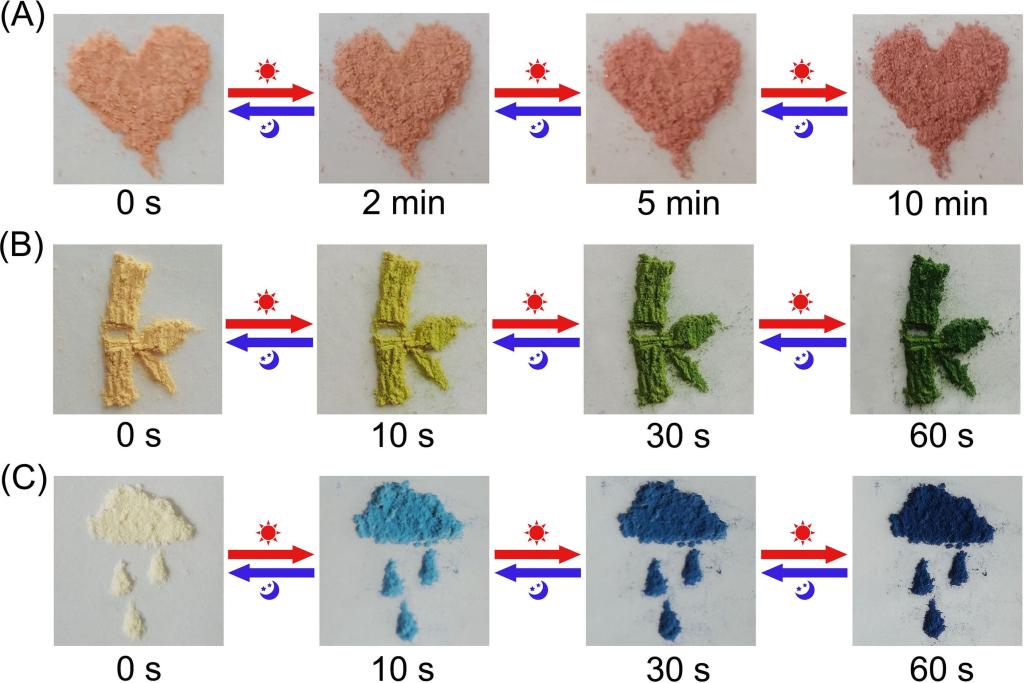 在自然界中,变色龙(蜥蜴)能够根据环境刺激改变颜色以融入环境。受此启发,人们致力于制造可以根据外界环境的变化而改变颜色的“智能皮肤”和“智能窗”。但目前该仿生技术仍然存在两大主要问题:(a)变色材料在光致变色反应过程中体积变化较大,结构不稳定且不可逆;(b)即使适当混合多种变色材料,其颜色范围通常也非常有限,无法实现全色域变色。因此,设计和合成具有变色能力的“智能皮肤”材料仍然是一个重大的挑战。在此,我们采用超分子策略合成出多种结构稳定且可逆的光致变色材料,通过混合效果不同的变色材料,就能得到一系列复合光致变色材料(CPM),在可见光下覆盖全色域范围。