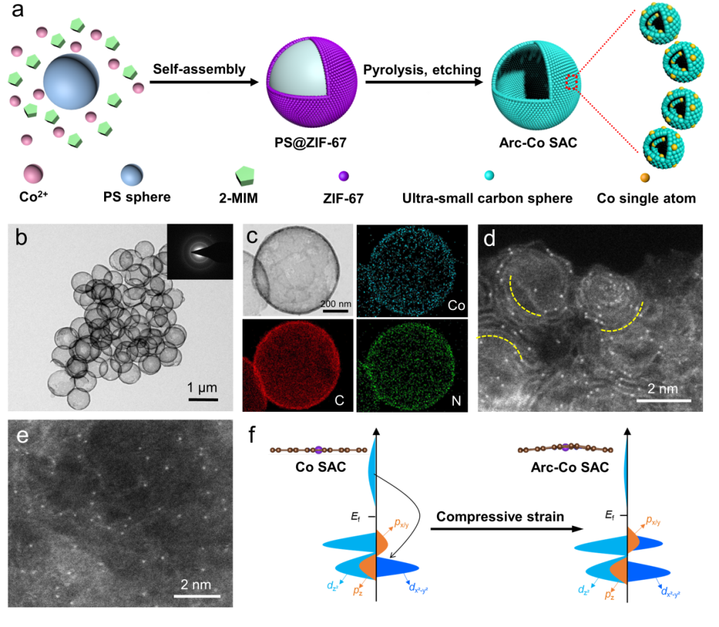 我校36365线路检测中心多相催化团队开发了一种受压缩应力的钴单原子催化剂,其不仅能增强氧还原反应活性,还能作为空气电极在零度下促进锌-空气电池的充放电。研究团队在具有极小曲率半径(约2 纳米)的高度弧形碳层上担载钴单原子(Arc-Co-SAC)来产生压缩应变,这种局域压缩应力诱导钴单原子d轨道不同空间取向的电子发生了重新分布,径向(xy平面)电子填充数增加,从而增强了其与活性中间体分子的有效电子轨道重叠程度,提高了氧还原的活性(图1)。