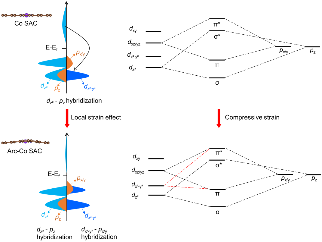 图1. 压缩应变诱导d轨道电子重新分布以及中间体和催化剂之间的d-p杂化。