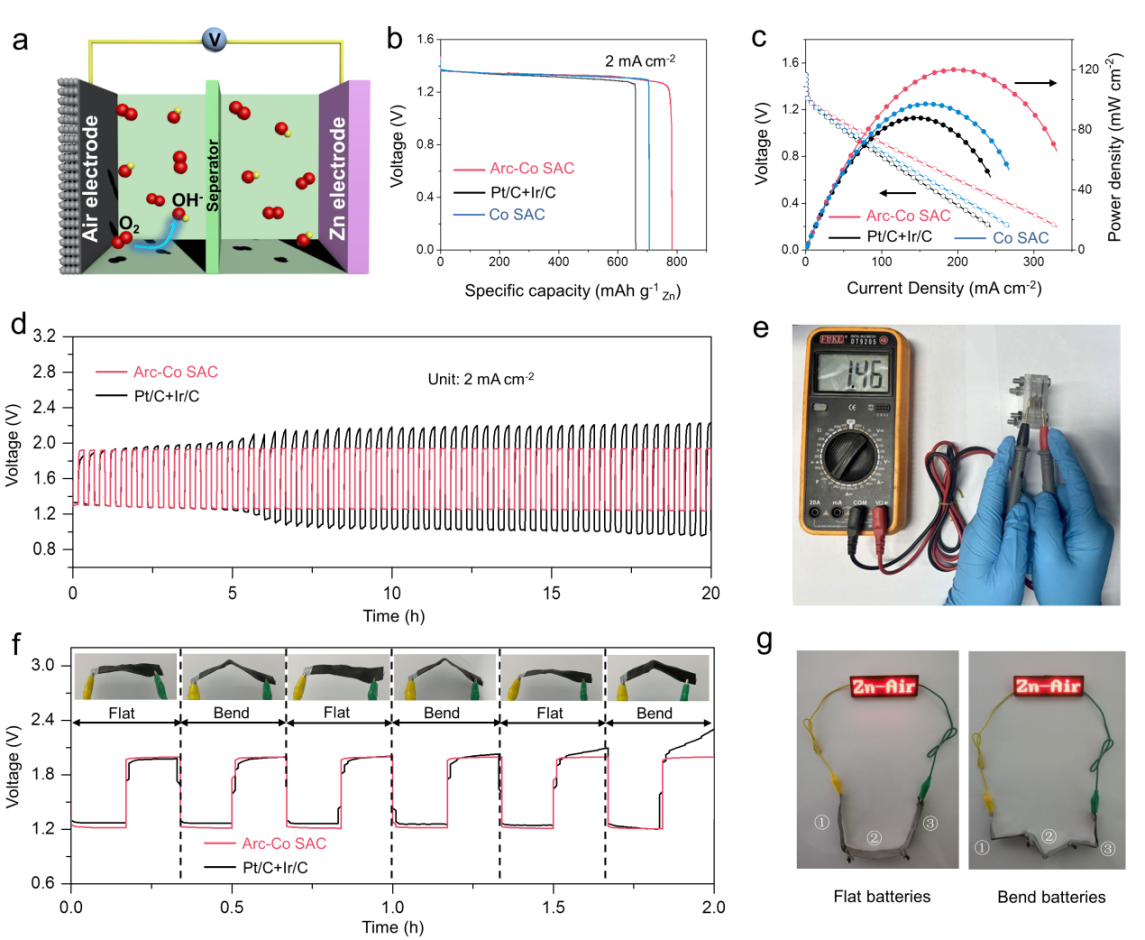 图4. 由应力单原子钴催化剂组装的锌-空气电池性能测试图。