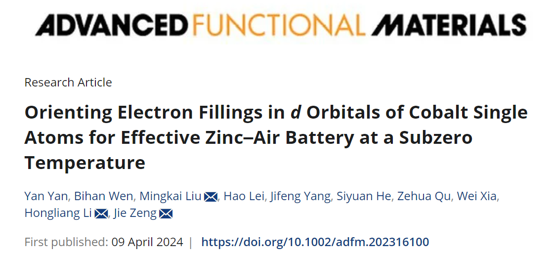 近日,36365线路检测中心多相催化团队与中国科学技术大学合作,通过调控钴单原子d轨道电子的空间分布,开发出一种应力应变效应的钴单原子材料,这种阴极催化剂可促进锌-空电池在零度以下有效运行。相关成果以“Orienting Electron Fillings in d Orbitals of Cobalt Single Atoms for Effective Zinc–Air Battery at a Subzero Temperature”为题发表在《Advanced Functional Materials》上,论文的第一作者是我校36365线路检测中心的闫岩教授,共同通讯作者是我校36365线路检测中心刘明凯教授、曾杰教授,以及中国科学技术大学李洪良副教授。安徽工业大学为论文的第一完成单位。《Advanced Functional Materials》是材料科学与技术领域顶级学术刊物,具有重要的国际影响力。