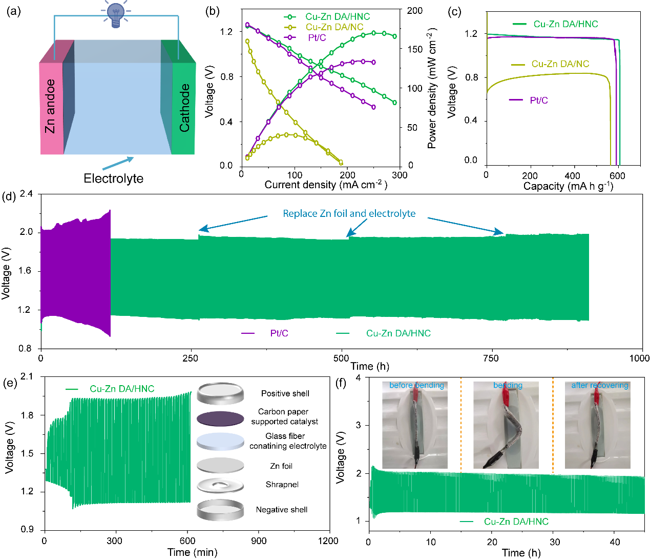 本研究利用柯肯达尔效应成功构建了N桥连Cu-Zn 双原子催化剂,Cu和Zn原子之间共享的N原子有利于增强双原子间的协同效应,有利于与O*结合,降低ORR反应能垒。所得到的N桥连Cu-Zn 双原子催化剂在碱性电解质中表现出优异的ORR活性,所构建的锌空气电池可以在空气中稳定充放电运行近900小时左右。