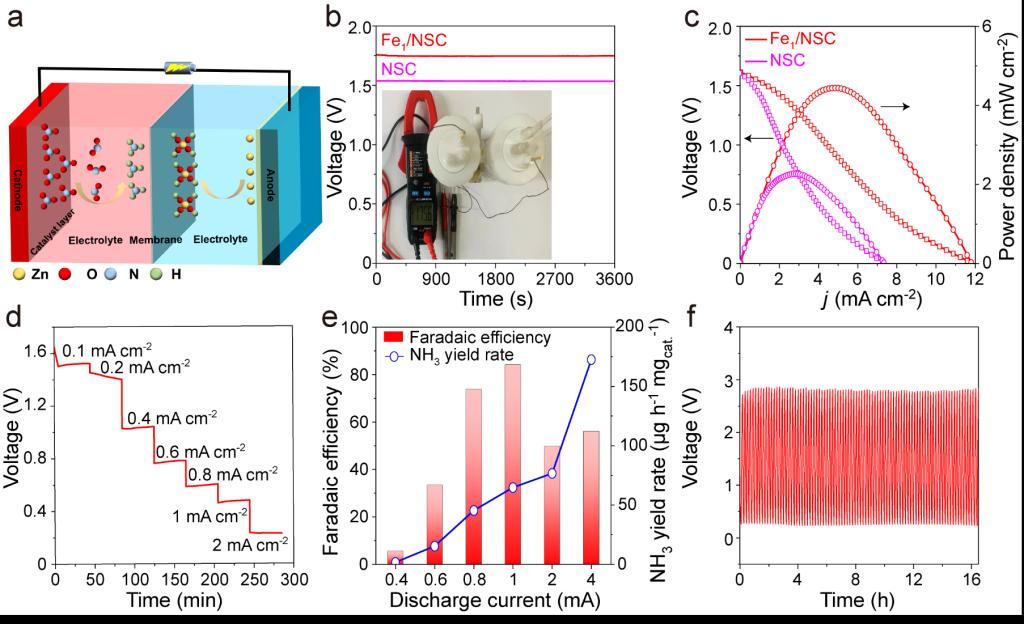 进一步以电化学硝酸根还原为模型反应,选取一元金属单原子位点(M1/NSC,M = Fe、Co、Ni、V、Cr、Mn、Mo、Pd、W、Re、Ir、Pt、Bi等)催化剂系统评价了其在电化学硝酸根还原反应中的性能,并利用原位衰减全反射傅里叶变换红外光谱(ATR-FTIR)和密度泛函理论(DFT)计算揭示了Fe1/NSC催化剂在硝酸还原反应中的催化机制和活性来源。最后,以Fe1/NSC为阴极组成Zn-NO3−概念性电池器件,其展示出高功率密度和很好的稳定性。该研究为氮氧化物资源高效利用与能量供给耦合提供了有意义的探索与实践。