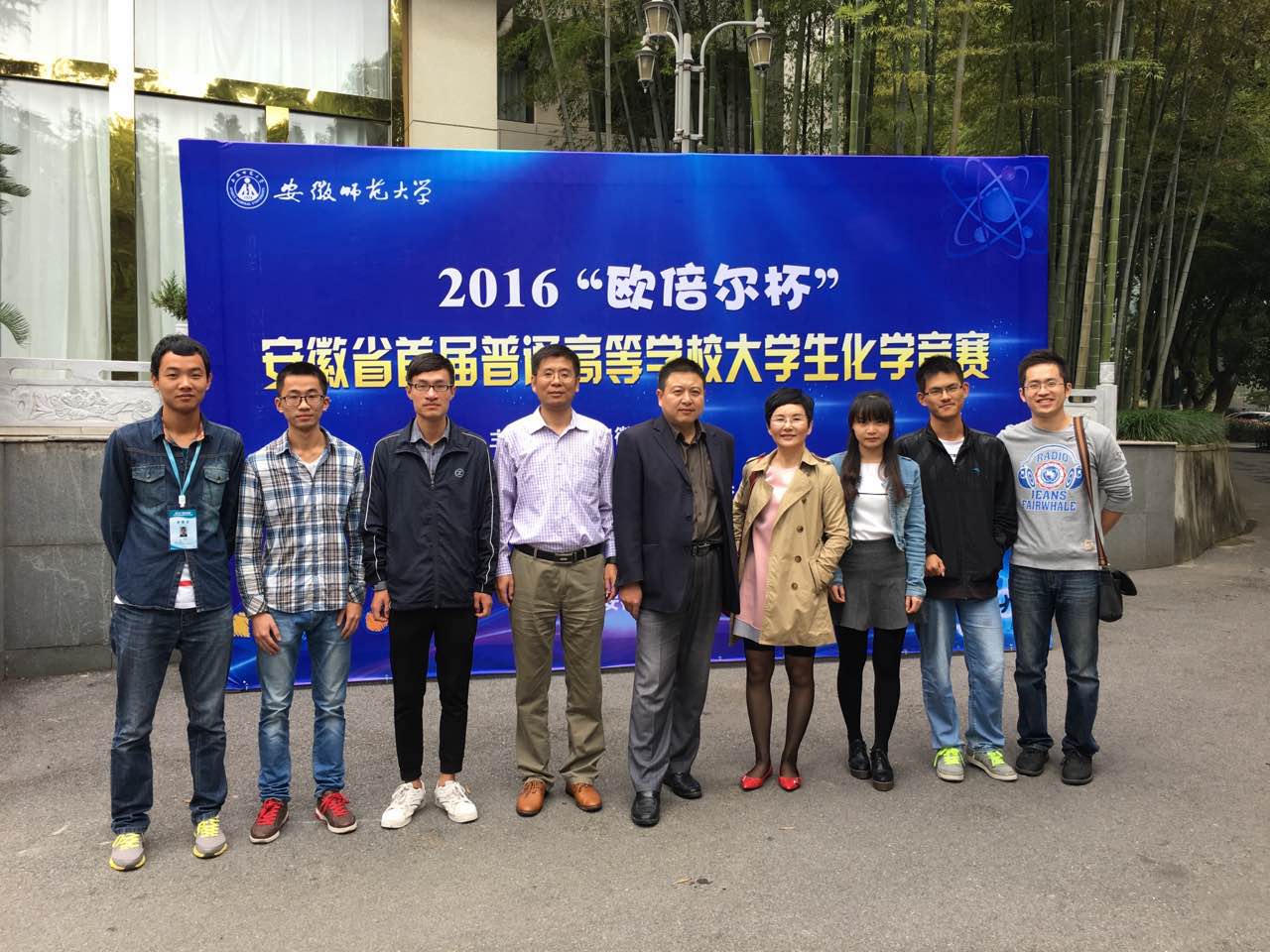 10月14至16日,由安徽省教育厅主办,安徽省化学会、安徽省高等学校化学化工实验教学中心联席会组织,安徽师范大学承办的2016年“欧倍尔”杯安徽省首届普通高等学校大学生化学竞赛决赛在安徽师范大学举行。我校36365线路检测中心胡慧慧、胡浙耀、陈世卓、王圣达以及王志伟五位同学代表学校赴芜湖参加决赛。
