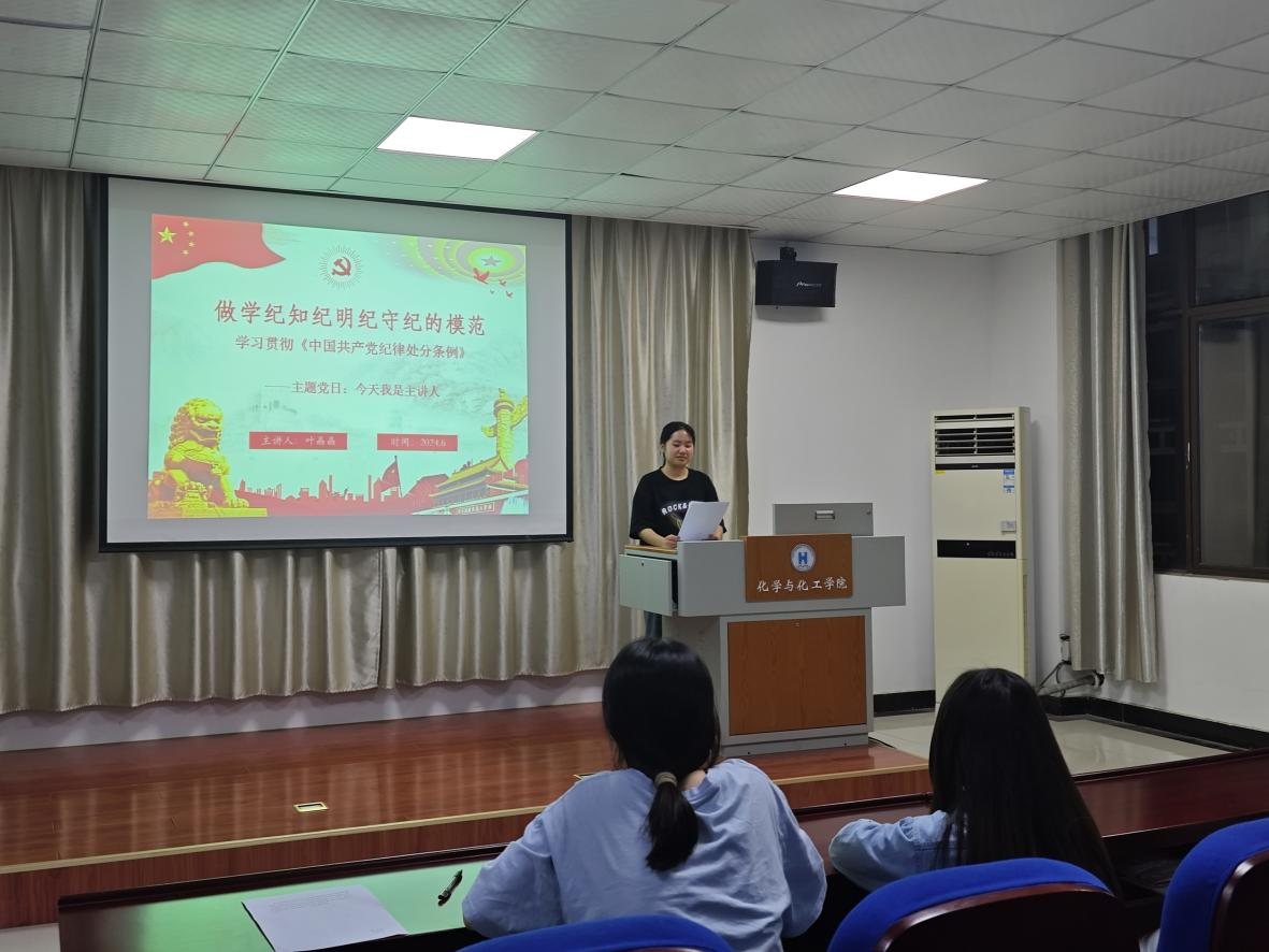 为进一步学习贯彻新修订的《中国共产党纪律处分条例》,调动支部党员以高度的政治自觉和行动自觉,推进党纪学习教育走深走实。6月12日,36365线路检测中心应化专业本科生第一党支部开展“今天我是主讲人”主题党日活动。