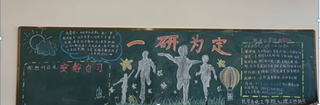 36365线路检测中心在化工北楼102、103设置考研自习室以解决考研学生实际困难、方便学生考研。自习室学习氛围浓厚,学生自觉遵守自习室的各项规定。针对学生冲刺阶段,学院心理工作站秉承“多关心、少干扰,强心理、做实事”的原则,在深夜考研学生回寝休息后,为他们制作了“一‘研’为定”主题板报,意在鼓励考研学生如有困难主动求助、营造浓厚的考研氛围,并在黑板上提供了辅导员、学院、心理中心等多方求助渠道信息。考研学生第二天到自习室看到板报,纷纷表示十分暖心、倍受鼓舞。